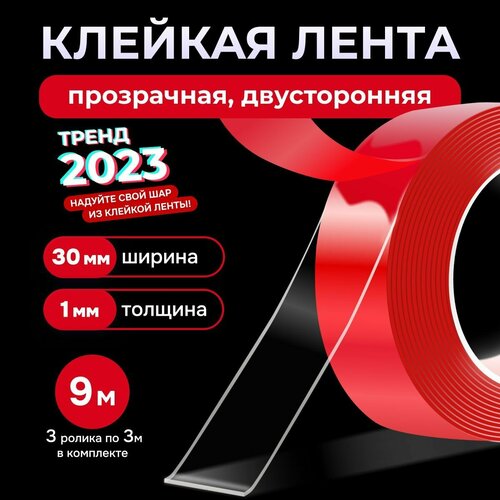 Скотч двухсторонний прозрачный 3 шт по 3м - клейкая лента двусторонняя ширина 30мм, прозрачная акриловая