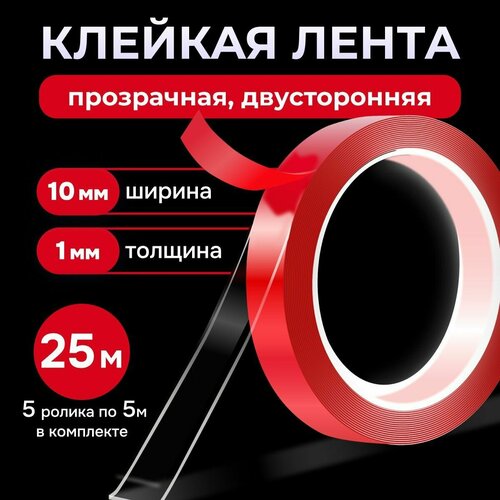 Скотч двухсторонний прозрачный 5 шт по 5м - клейкая лента двусторонняя ширина 10мм, прозрачная акриловая