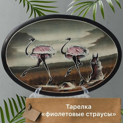 Круглое Каменное Декоративное блюдо Ручной Работы "Фиолетовые страусы"