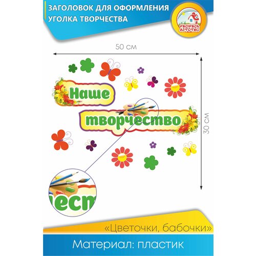 Заголовок для оформления уголка творчества "Цветочки и бабочки" со скотчем для крепления к стене