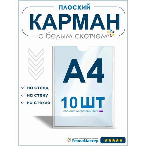 Карман А4 для стенда плоский, ПЭТ 0,3 мм, набор 10 шт, белый скотч. Рекламастер