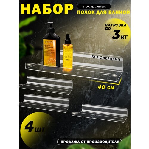 Полка для ванной комнаты без сверления прозрачная 40 см комплект 4шт оргстекло 3мм Рекламастер HOME