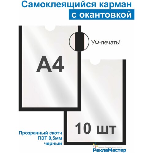 Карман А4 для стенда плоский черный, ПЭТ 0,5 мм, набор 10 шт, прозрачный скотч. Рекламастер