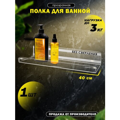 Полка для ванной комнаты без сверления прозрачная 40см , оргстекло 3мм, Рекламастер / полка без сверления