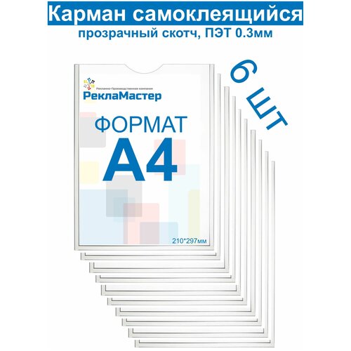 Карман А4 для стенда плоский, ПЭТ 0,3 мм, набор 6 шт, прозрачный скотч. Рекламастер
