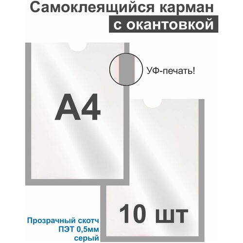 Карман А4 для стенда плоский серый, ПЭТ 0,5 мм, набор 10 шт, прозрачный скотч. Рекламастер
