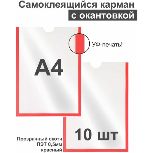 Карман А4 для стенда плоский красный, ПЭТ 0,5 мм, набор 10 шт, прозрачный скотч. Рекламастер
