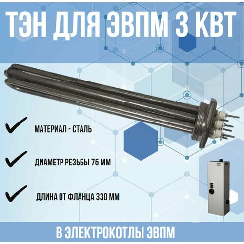 ТЭН / тен (нагревательный элемент) для электрокотлов ЭВПМ 3 кВт, уст. длина 330 мм, d75 мм.