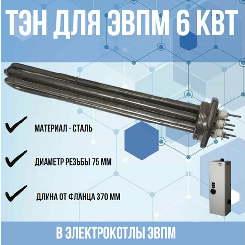 ТЭН / тен, тенб, СЭВ (нагревательный элемент) для электрокотлов ЭВПМ 6 кВт (6000Вт), блок, уст. длина 370 мм, d75 мм.