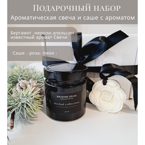 Подарочный набор, Саше ароматическое Розовый пион и Свеча ароматическая Бергамот, нероли, апельсин, 200мл, подарок женщине, на 8 марта
