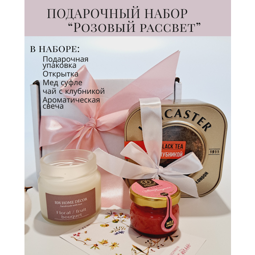 Подарочный набор "Розовый рассвет", набор, чай, мед, ароматическая свеча, набор сладостей бокс