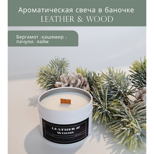 Свеча ароматическая с ароматом "Кожи и дерева", 120 мл, свеча с деревянным фитилем, свеча в банке