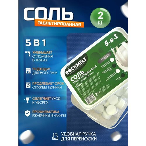 Соль таблетированная Rockmelt для посудомоечных машин 5-в-1 с профилактикой ржавчины и накипи, ведро 2 кгСоль таблетированная для посудомоечных машин 5-в-1, ведро 2 кг