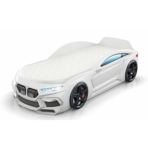 Кровать-машинка Romeo с ящиком Белый, с подсветкой фар, с матрасом