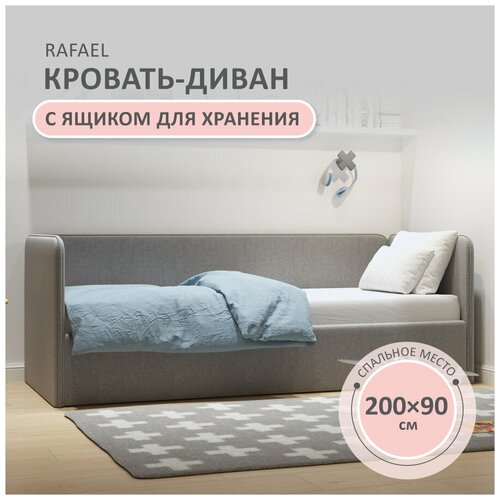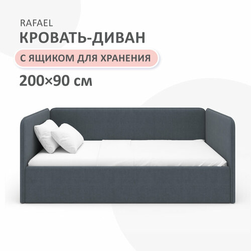Кровать диван Rafael 90x200 серый велюр односпальная детская с ящиком для белья + боковина большая, с мягким изголовьем