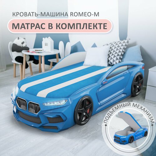 Кровать детская машина Romack Romeo-M голубая, с подсветкой фар, ящиком для белья, объемными колесами, матрасом 70х170 см в фирменной обшивке
