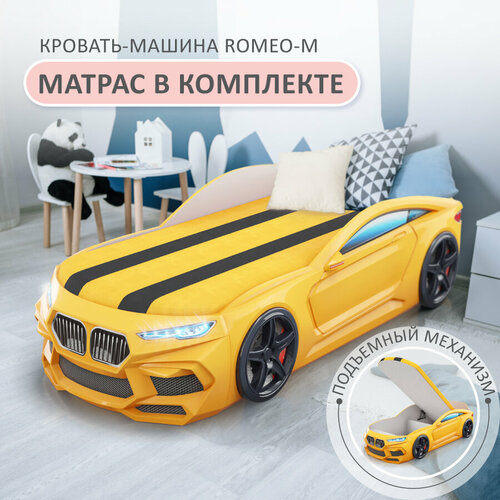 Кровать детская машина Romack Romeo-M желтая, с подсветкой фар, подъемным механизмом, ящиком для белья, объемными колесами, матрасом 70х170 см