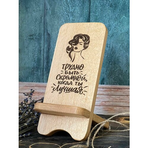 Подставка для телефона из дерева Rossovideti с гравировкой "Трудно быть скромной"