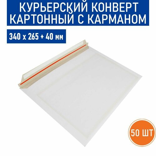 Курьерский конверт картонный с карманом, белый, 340х265+40 мм - 50 шт.