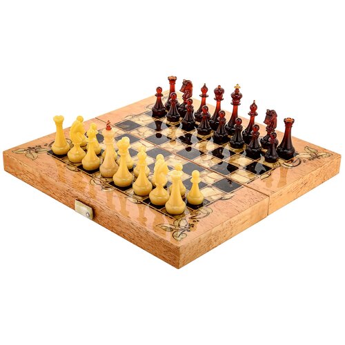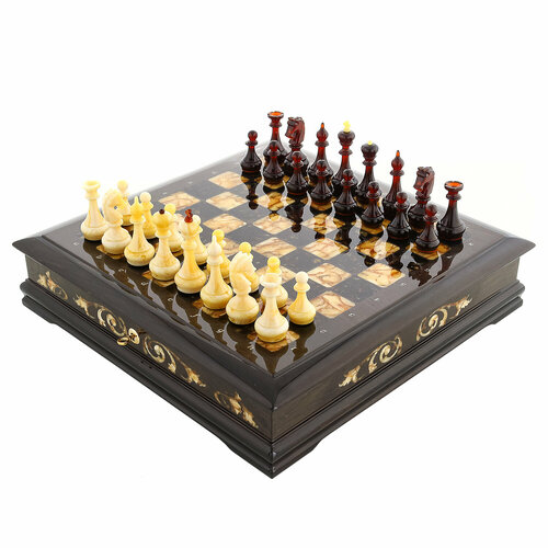 Шахматы из мореного дуба с инкрустацией и фигурами из янтаря 45,5х45,5 см