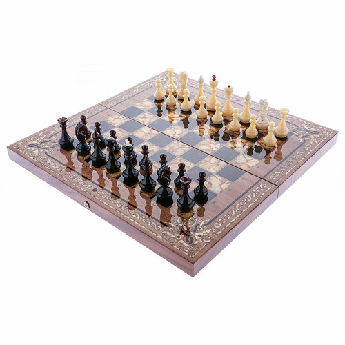 Шахматный ларец с натуральным перламутром и фигурами из кости и дерева 45х45 см