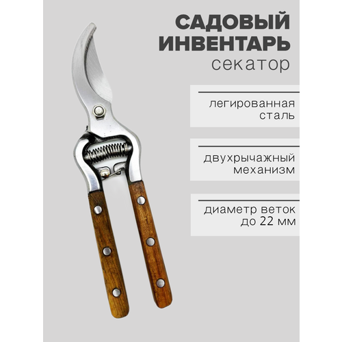 Секатор садовый Sali, Сучкорез профессиональный цельнометаллический с пружинным механизмом и деревянной рукояткой, диаметр реза до 22мм