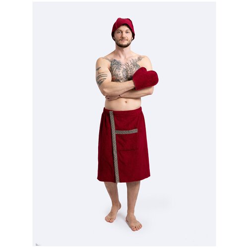 Килт банный мужской махровый, комплект 3 шт. для сауны. Бордовый.