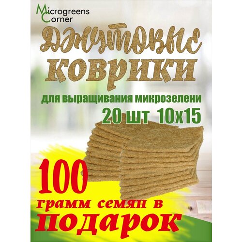 Джутовый коврик для микрозелени 20 шт, семена 100 грамм, джут, 10х15, для проращивания, микрозелень