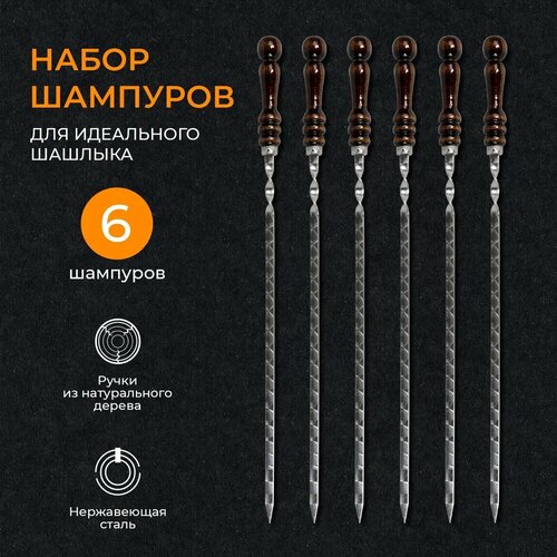Набор шампуров 62 см 6 штук / Шампуры из нержавеющей стали с деревянной ручкой из бука