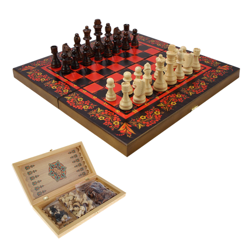 Набор игр шахматы нарды, шашки с доской Хохлома красная, 40 х 40 см KSVA-SA-SH-503