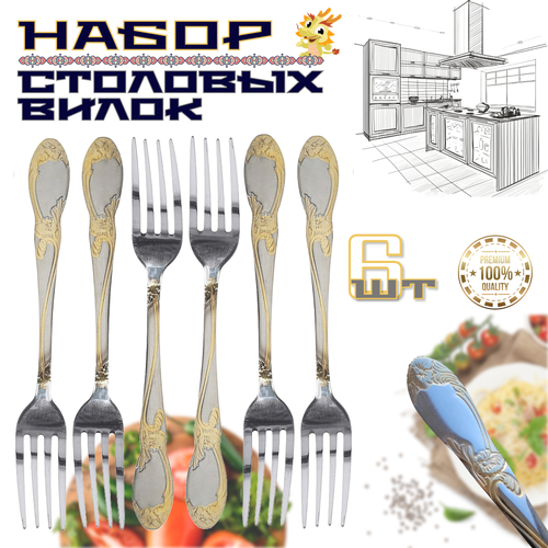 Вилки столовые набор 6 штук с цветочным орнаментом, длина 21 см