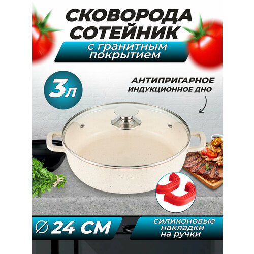 Сковорода - сотейник с гранитным покрытием, крышкой и антипригарным дном, кастрюля, жаровня, 3 литра, 1 шт.