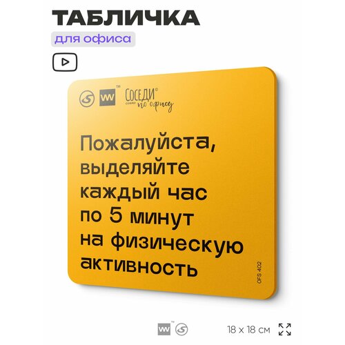 Табличка с правилами офиса "Выделяйте каждый час по 5 минут на физическую активность" 18х18 см, пластиковая, SilverPlane x Айдентика Технолоджи