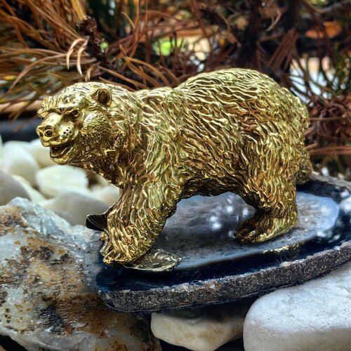 Статуэтка из бронзы и мельхиора на срезе натурального агата "Медведь поймал лосося"