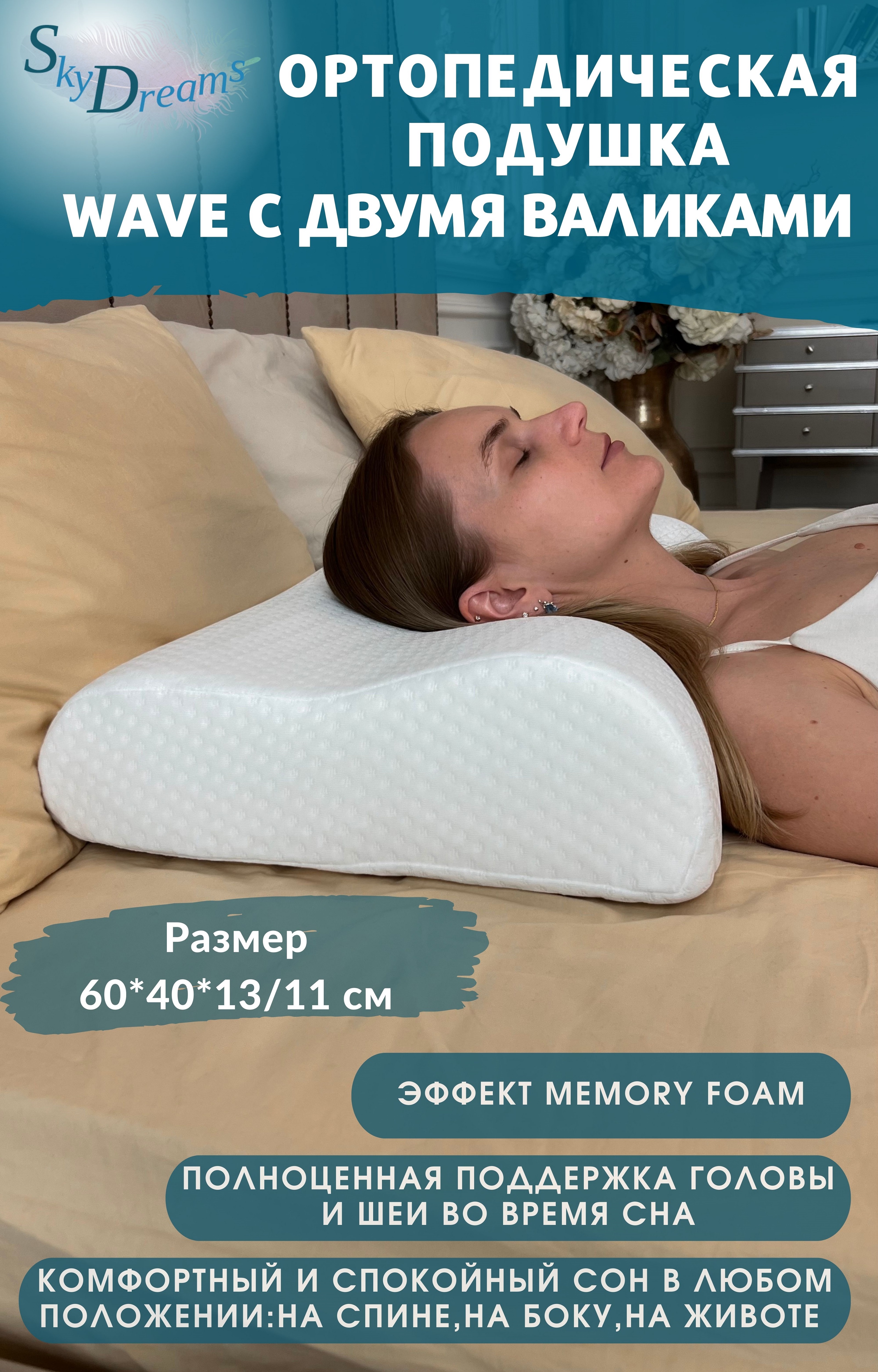 Анатомическая подушка "SkyDreams" WAVE, с эффектом памяти, двумя валиками 60х40х13/11 см
