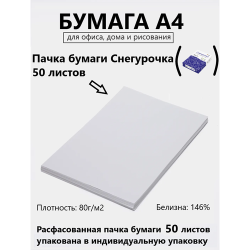 Офисная бумага Снегурочка А4, 50 листов для печати, принтера , плотность 80 г/м2, белизна 146%, в индивидуальной упаковке