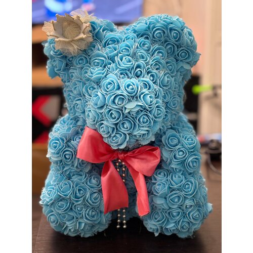 "Снежок" - Мишка из искуственных 3D роз 35см, 1000 цветков, голубой , 1шт