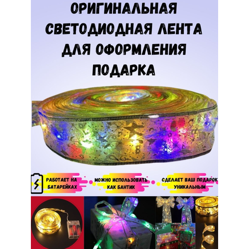 Светодиодная тесьма с диодами. Золотая тесьма 5 метров. Звезды с разноцветными диодами. Работает от батареек