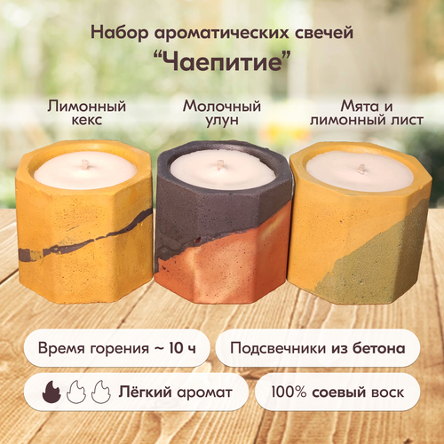 Набор ароматических свечей "Чаепитие" (Лимонный кекс, Молочный улун, Мята и лимонный лист) из соевого воска в подсвечниках из бетона 4,7 х 5,5 см