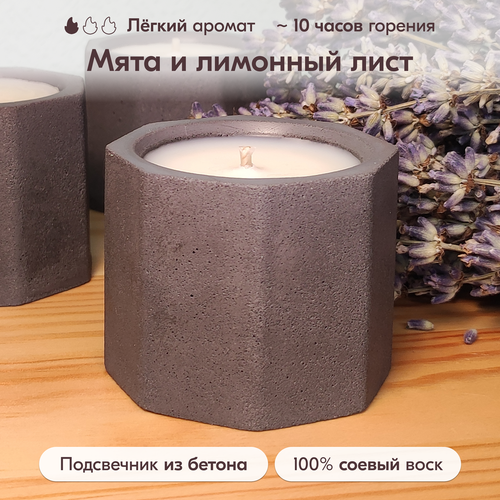 Свеча ароматическая "Мята и лимонный лист" из соевого воска в подсвечнике из бетона 4,7 х 5,5 см