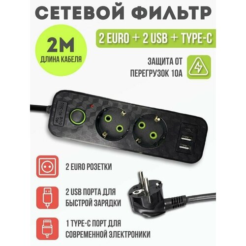 Сетевой фильтр, бытовой удлинитель с Type-C и USB, длина 2 метра