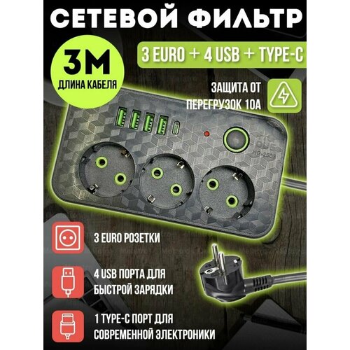 Сетевой фильтр, бытовой удлинитель с Type-C и USB, длина 3 метра