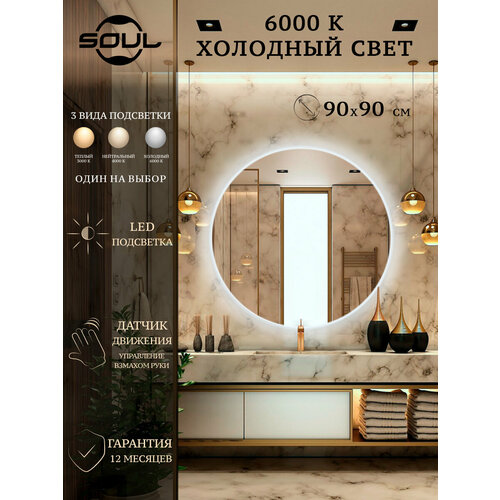 Зеркало с подсветкой настенное в ванную круглое 90см 6000К холодный белый свет, сенсор по взмаху руки