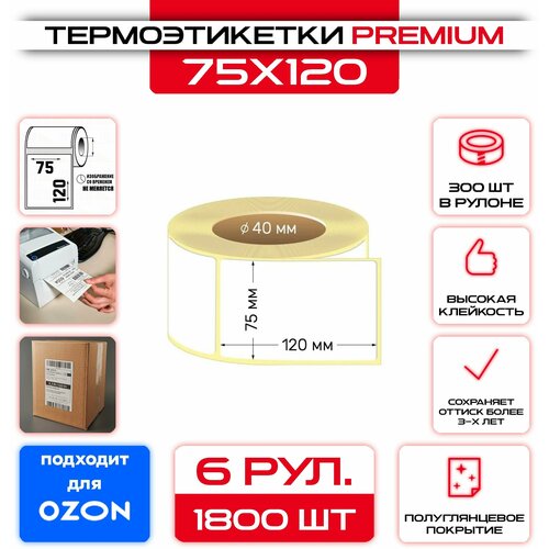 Термоэтикетки 75х120 мм (уп - 6шт, 300шт в рулоне) ЭКО, для термопринтера / для Озон / Самоклеящиеся
