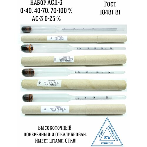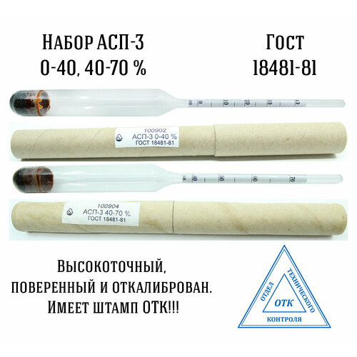 Набор ареометров для спирта профессиональный АСП-3 (0-40, 40-70, 70-100%) , ГОСТ 18481-81
