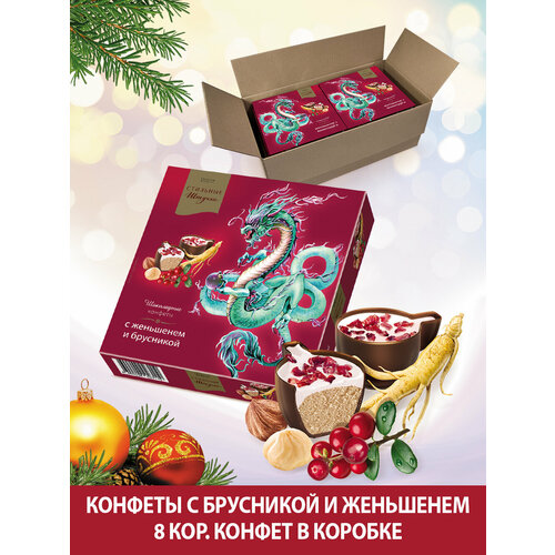 Конфеты шоколадные Стильные штучки Мусс с женьшенем и брусникой подарочные в новогодней коробке с символом Нового года Драконом, 8 шт по 104 г