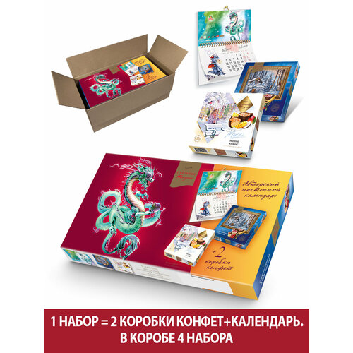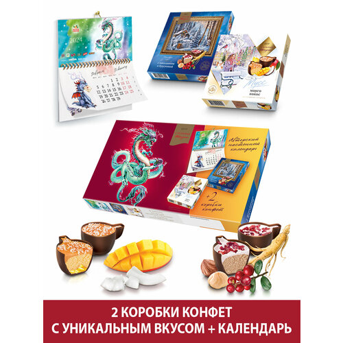 Конфеты шоколадные Стильные штучки манго-кокос и женьшень-брусника подарочные в новогодней коробке с календарем и символом Нового года Драконом, 208 г