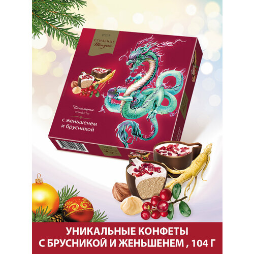Конфеты шоколадные Стильные штучки Мусс с женьшенем и брусникой подарочные в новогодней коробке с символом Нового года Драконом, 104 г