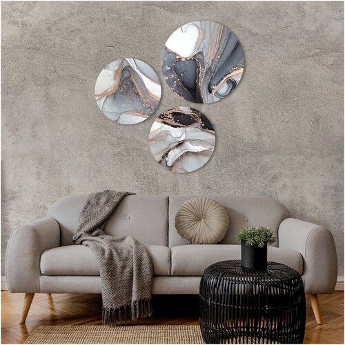 Набор из интерьерных круглых картин на холсте, "Серые переливы" от STUDIO A3", 40х40 см. (2 шт.) и 50х50 см. (1шт.) в подарок (ECO - печать)