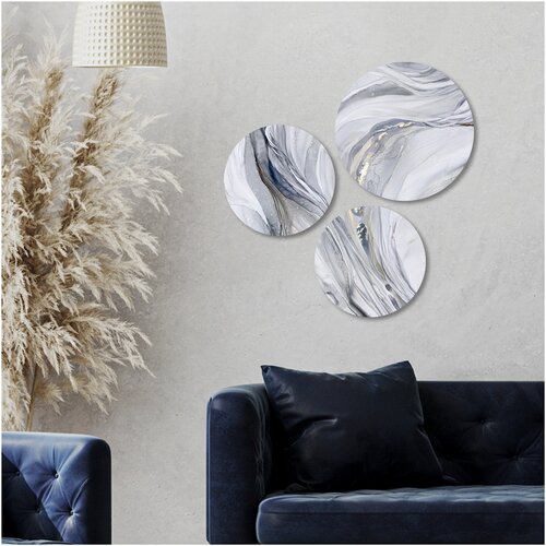 Набор из интерьерных круглых картин на холсте, "Серебристая вуаль" от STUDIO A3", 40х40 см. (2 шт.) и 50х50 см. (1шт.) в подарок (ECO - печать)
